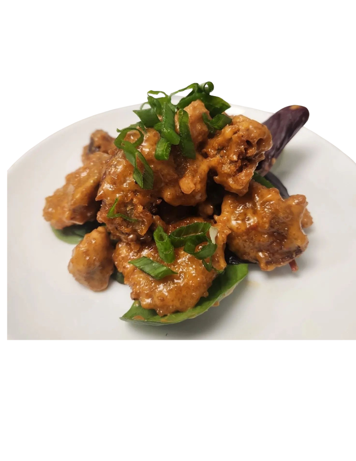 Crispy mushrooms are tossed in Que Dabra sauce and topped with green onions. Served on a bed of lettuce.