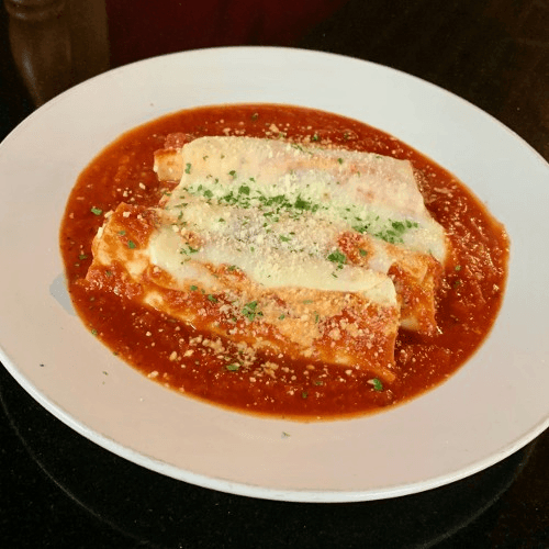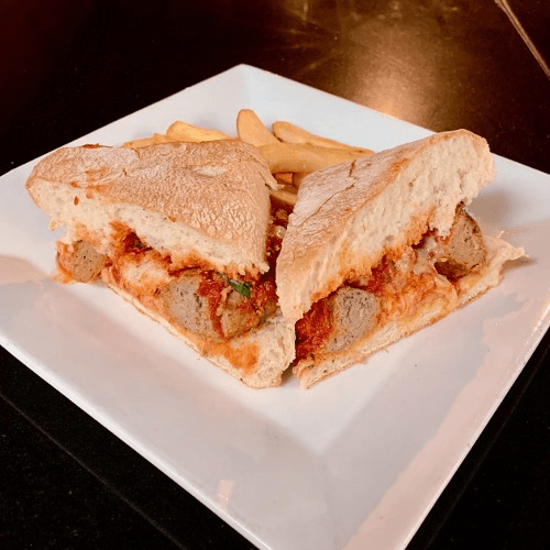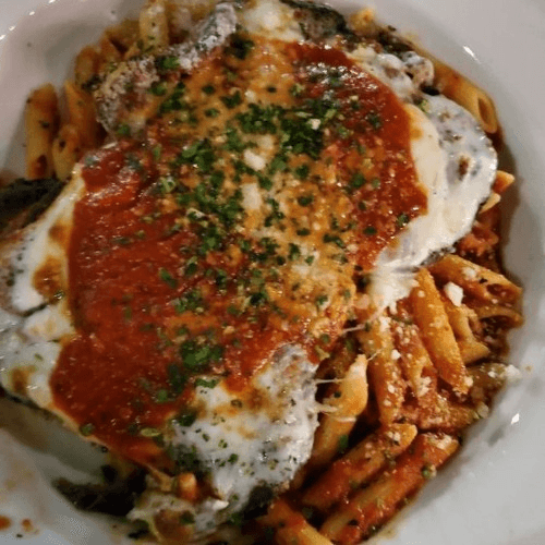 perfectly seasoned and breaded, fresh mozzarella, Sunday Sauce, basil, served with a side of penne