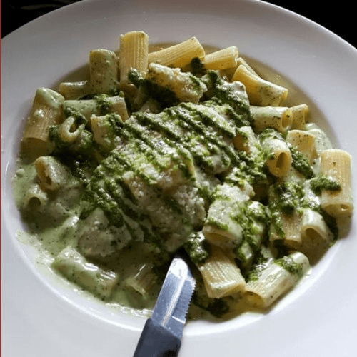 flattened and sautéed in a rich pesto cream over rigatoni