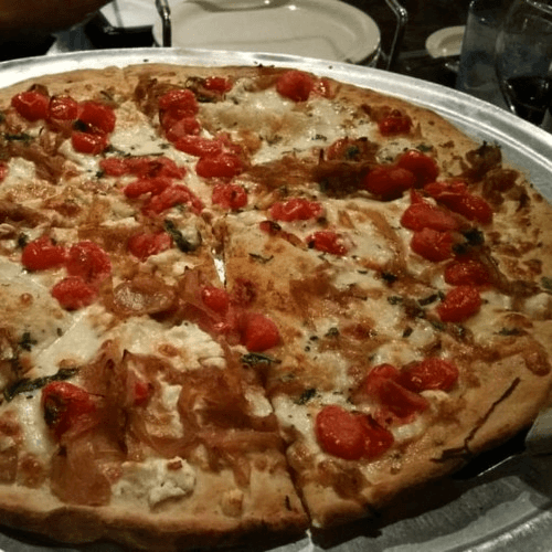 layered with goat cheese, caramelized onions, roasted grape tomatoes, mozzarella