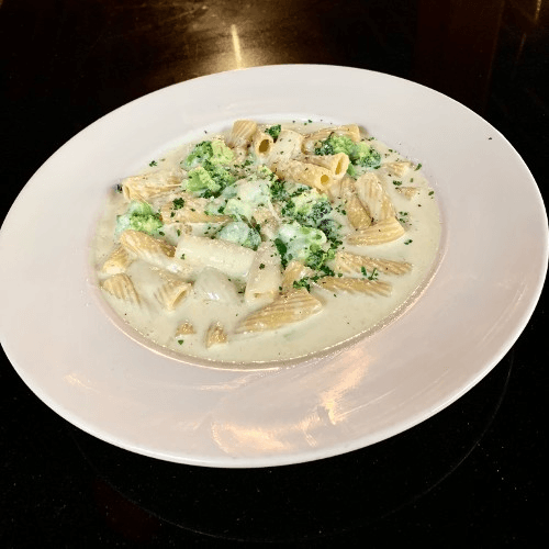 with fresh broccoli, rich cheese cream sauce, flat Italian parsley, topped with mozzarella